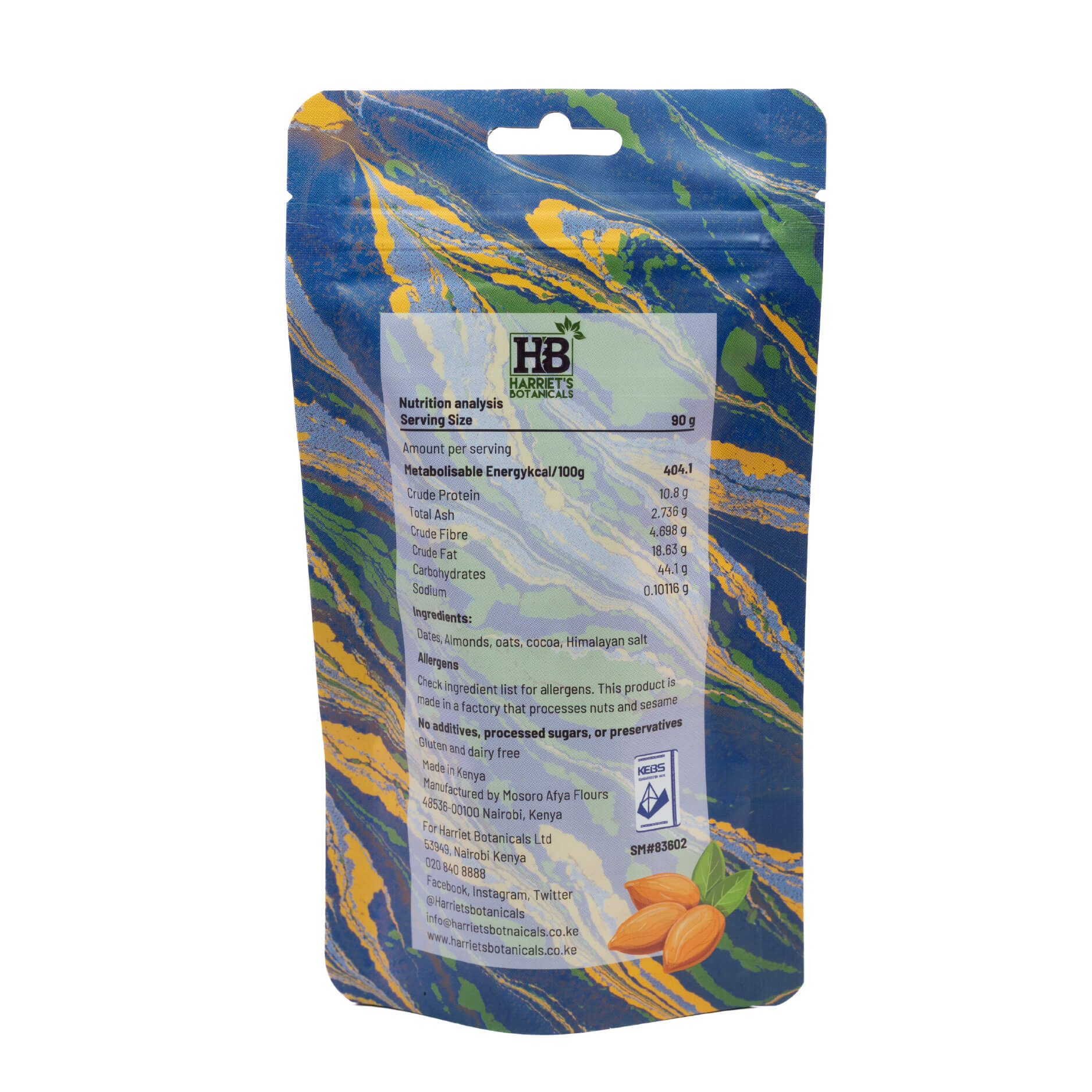 Dates, Almonds, oats, cocoa, and Himalayan salt.